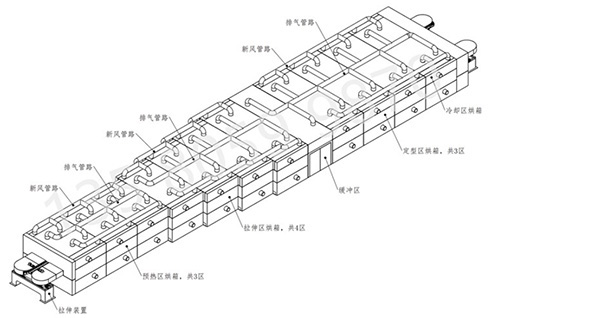 在橫拉設備中烘箱主要為薄膜預熱、拉伸、定型、冷卻過程中提供一個密閉保溫的空間,并且烘箱內部按區(qū)域功能及一定間距為由隔斷板間隔開。